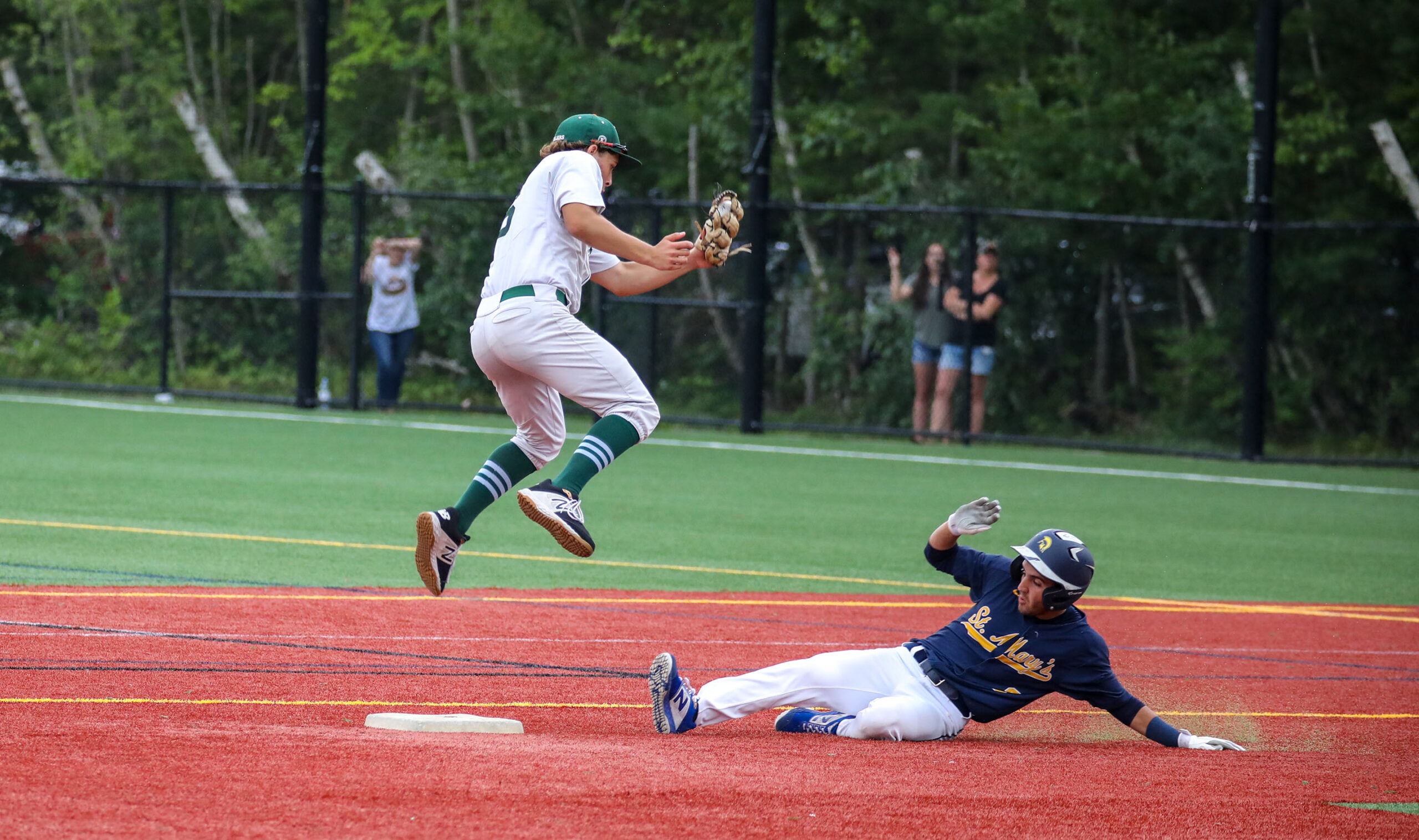 - Cam Jerrett leaps for a throw from the catcher but is too late to nab the St. Mary’s base-stealer. PHOTO/JOHN CARDILLO