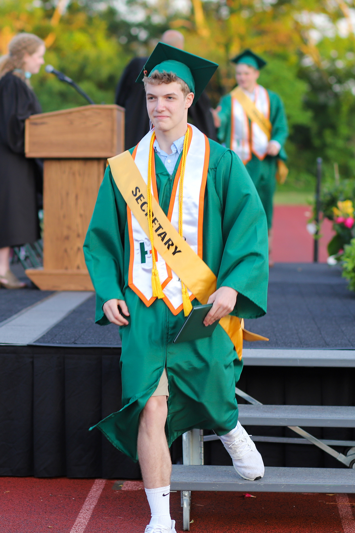 - Class secretary Danny Andrews departs the stage. PHOTO/CHRISTINE STRICKLAND
