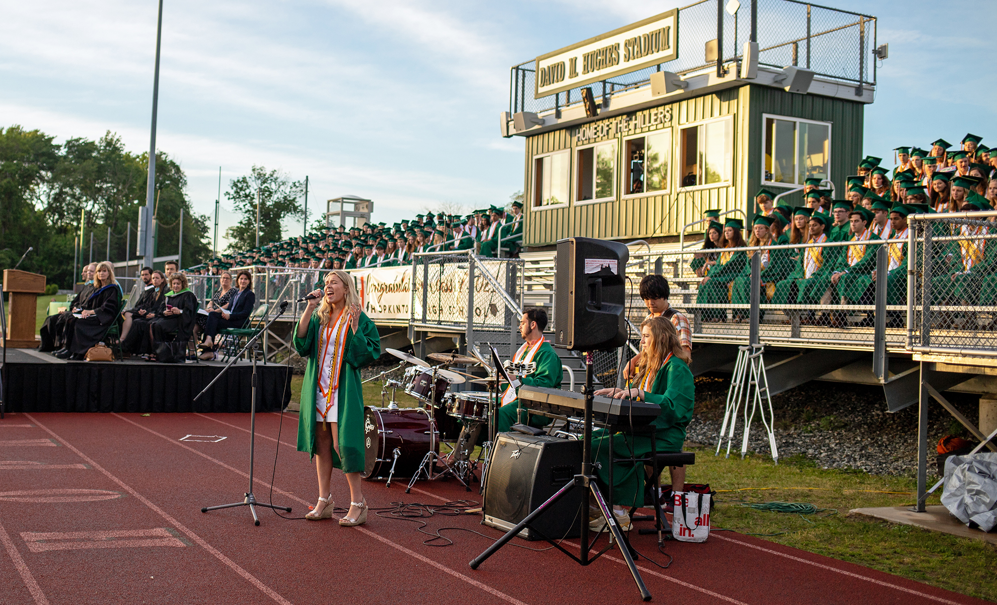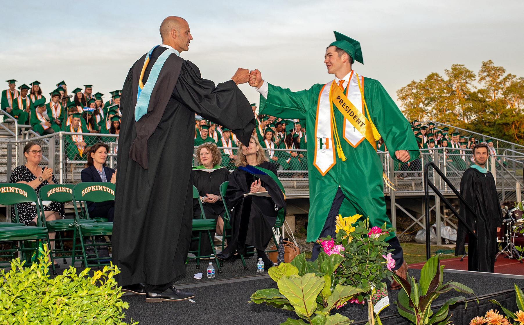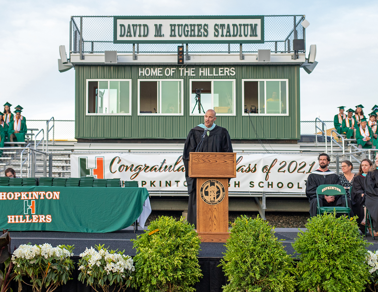 The Hopkinton High School Class of 2021 — which at 328 students is the largest in school history — overcame one final challenge before graduating Friday night, as an afternoon rain delayed commencement exercises by an hour.