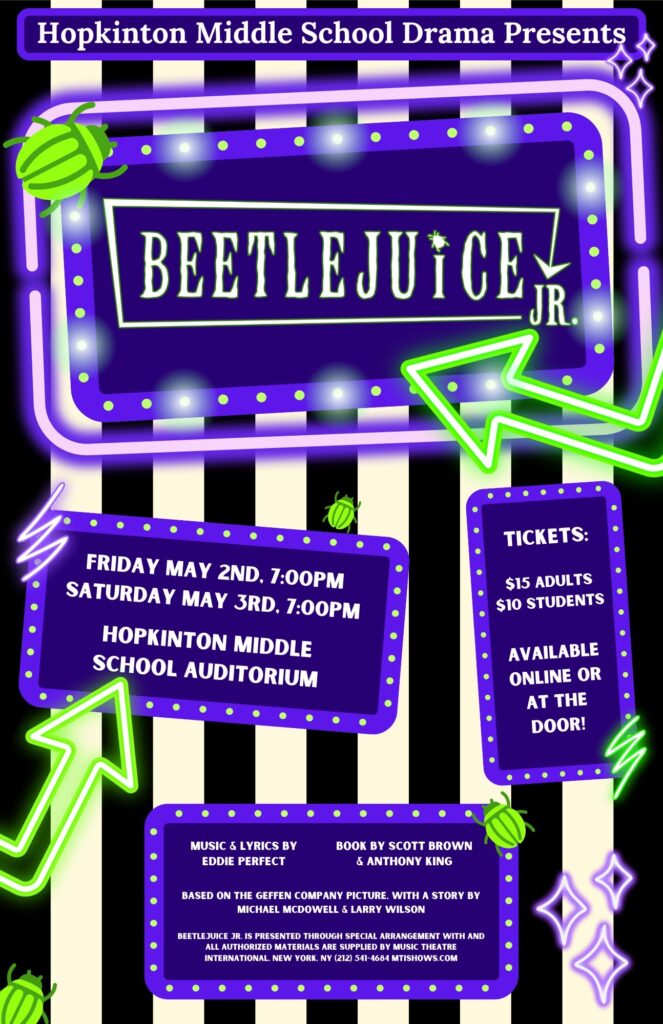 Hopkinton Middle School Drama will stage a production of “Beetlejuice Jr.” May 2 and 3 in the HMS auditorium. The musical, adapted from the hit Broadway show, is something the students have been eager to perform for audiences since last fall.