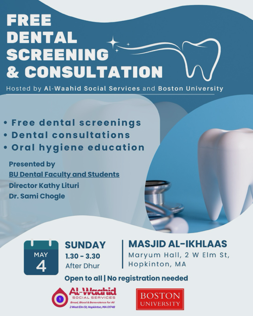 On Sunday, the Masjid Al-Iklhaas mosque in Hopkinton will be hosting the free dental event, which will feature screenings, consultations and oral hygiene education. Both students and faculty from BU’s dental school will be on hand to evaluate patients and give feedback.