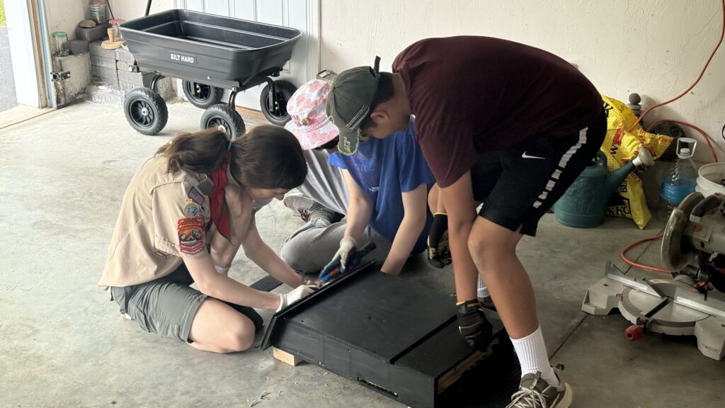 Thomas Donahue (left) works with volunteers to construct a bat box as part of his Eagle Scout project.