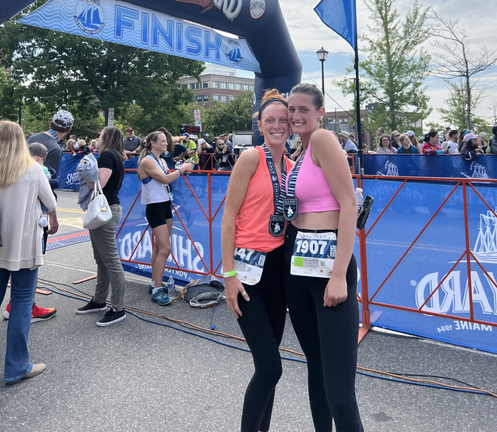 Friends Grace Vaughan (left) and Samantha Purpura, pictured after running a half marathon in Portland, Maine, will run together in the Boston Marathon for the South Boston Neighborhood House.
