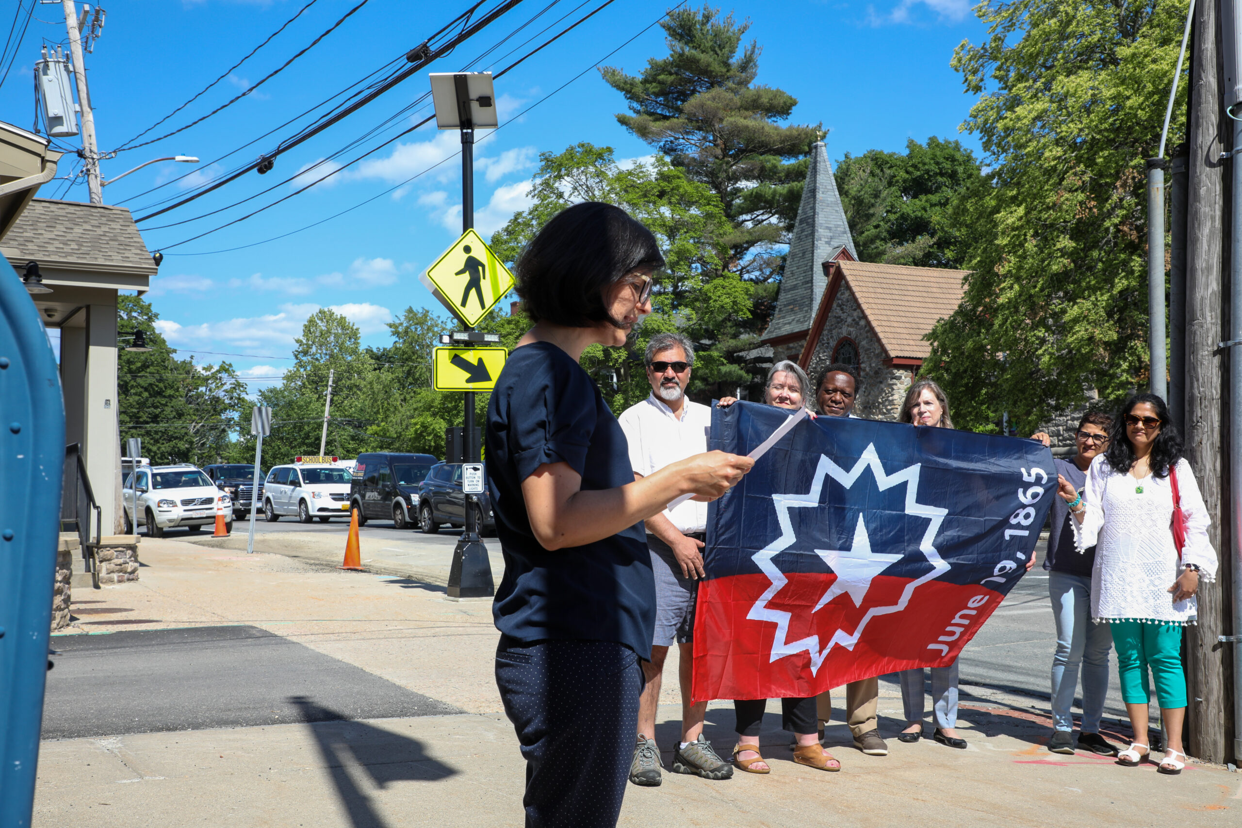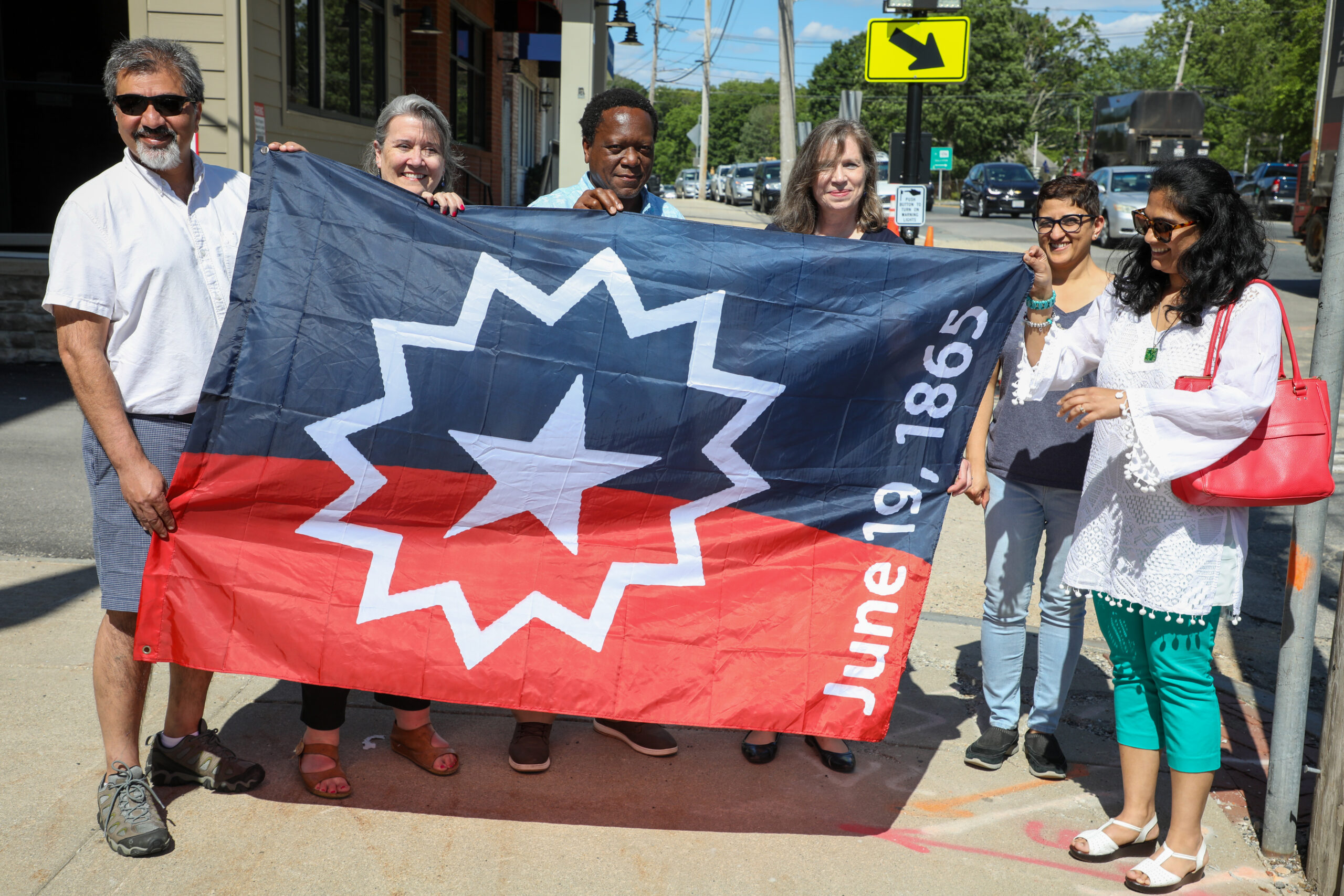 The Juneteenth flag, commemorating the emancipation of enslaved people in America, was raised at Town Hall on Thursday afternoon. Members of the Hopkinton Freedom Team were joined by two Select Board members and town executives for the ceremony. The flag will fly until July 4.