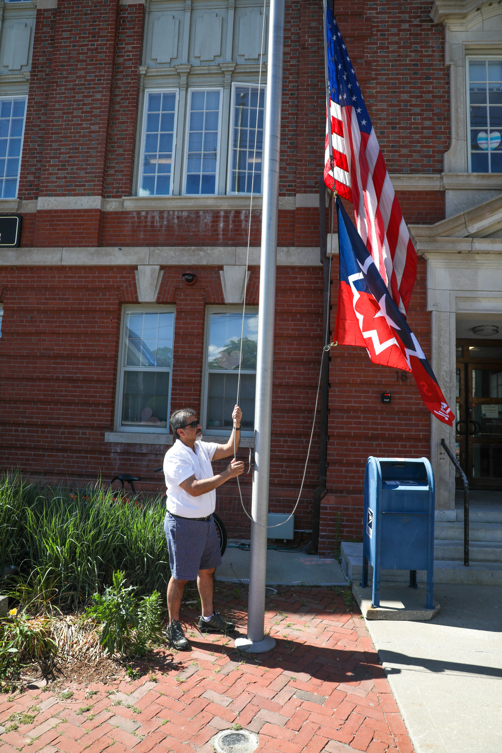 - Select Board chair Irfan Nasrullah raises the flag. PHOTO/JOHN CARDILLO