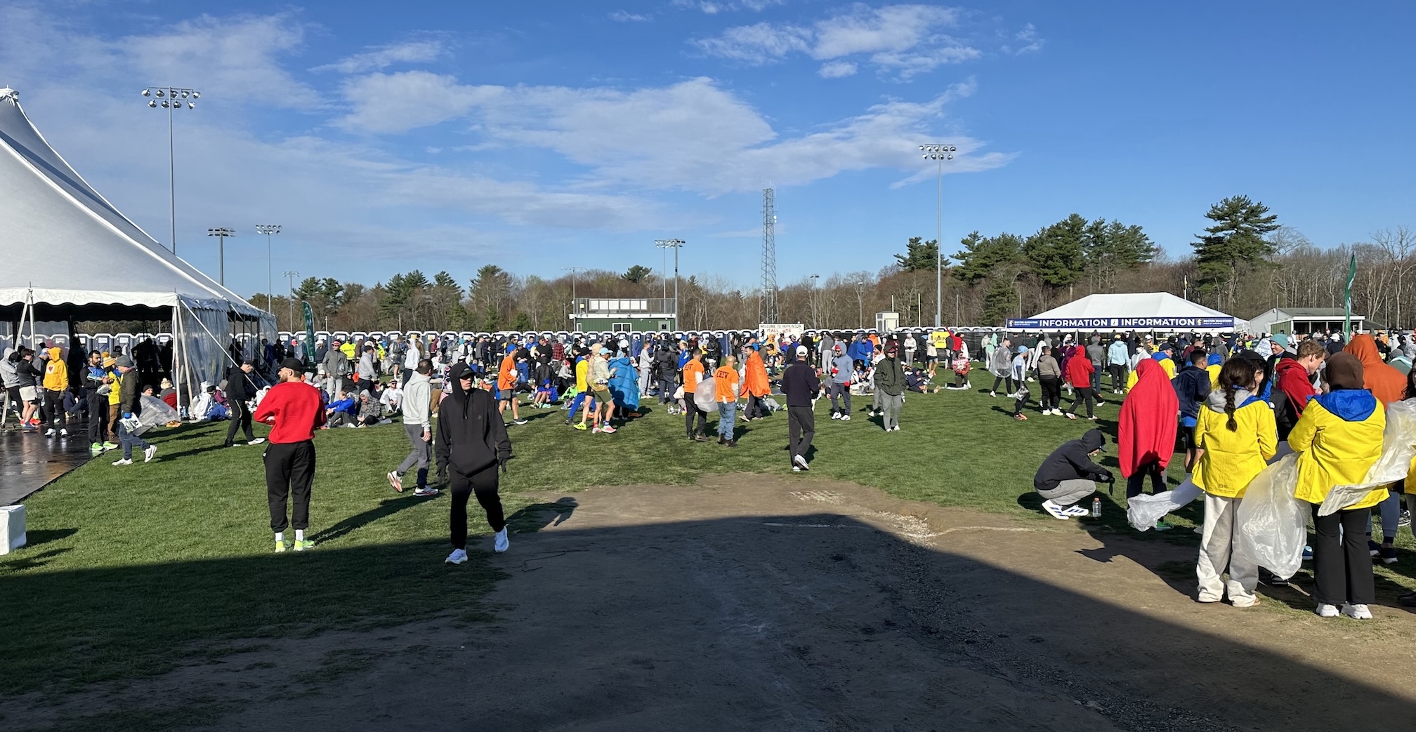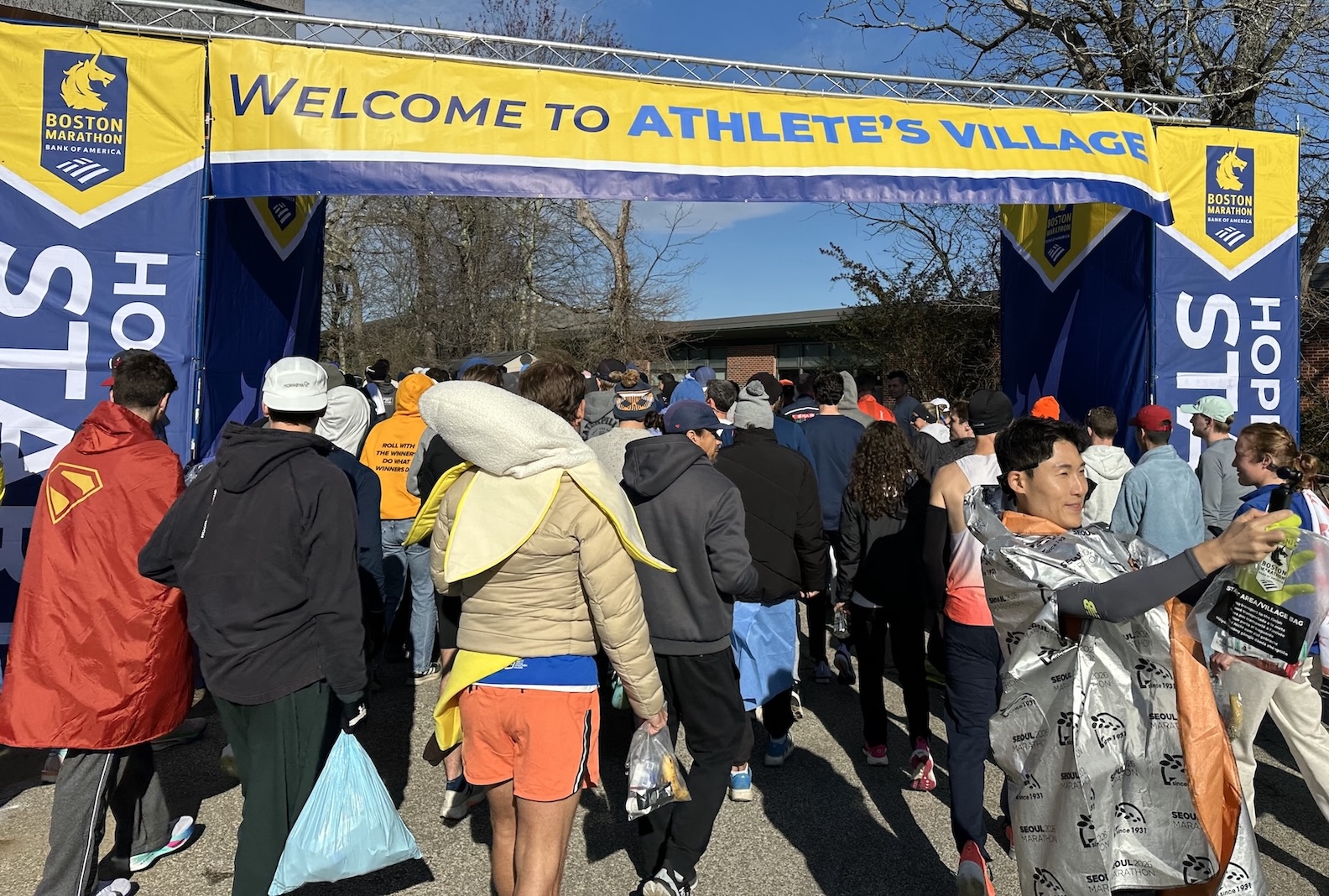 - Participants head into the athletes village to await their starting groups after being dropped off by buses outside Hopkinton High School. PHOTO/JERRY SPAR