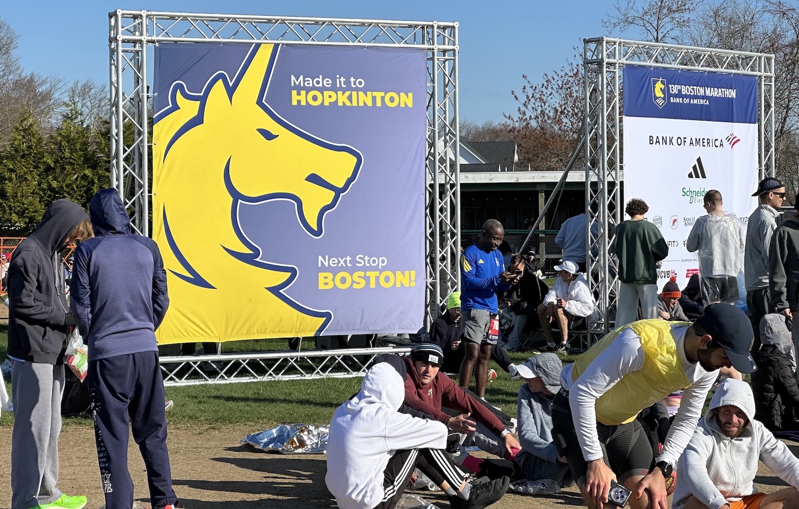 - Athletes relax in front of a sign welcoming them to Hopkinton. PHOTO/JERRY SPAR