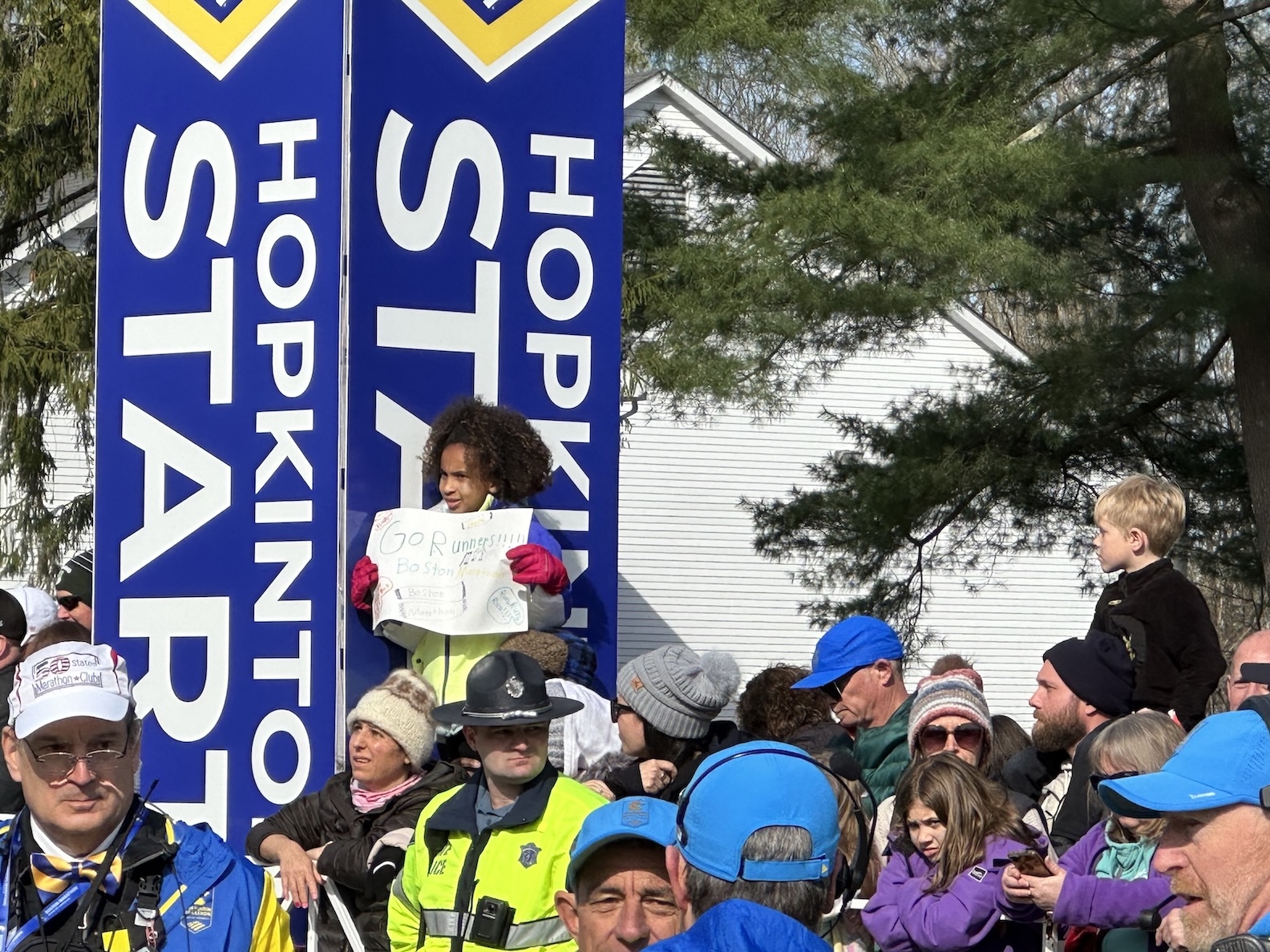 - A runner at the athletes village gets a photo in front of a replica of the Hopkinton Marathon Committee’s famous sign (the original is at the Town Common). PHOTO/JERRY SPAR