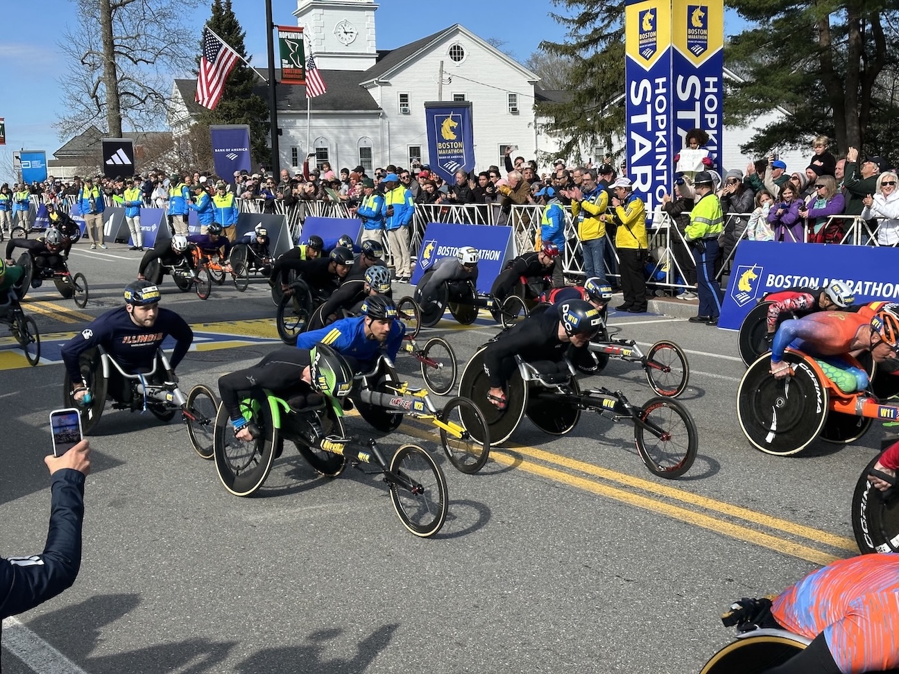 - Eventual winner Eden Rainbow-Cooper (W101) is among the leaders at the start of the women’s wheelchair race. PHOTO/JERRY SPAR