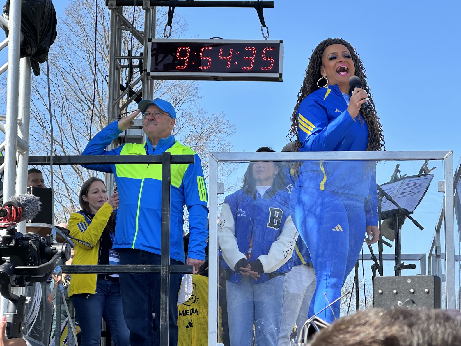 - Hopkinton’s Alex Danahy, a longtime race volunteer, prepares to fire the starting gun for the para athletics division. PHOTO/JERRY SPAR