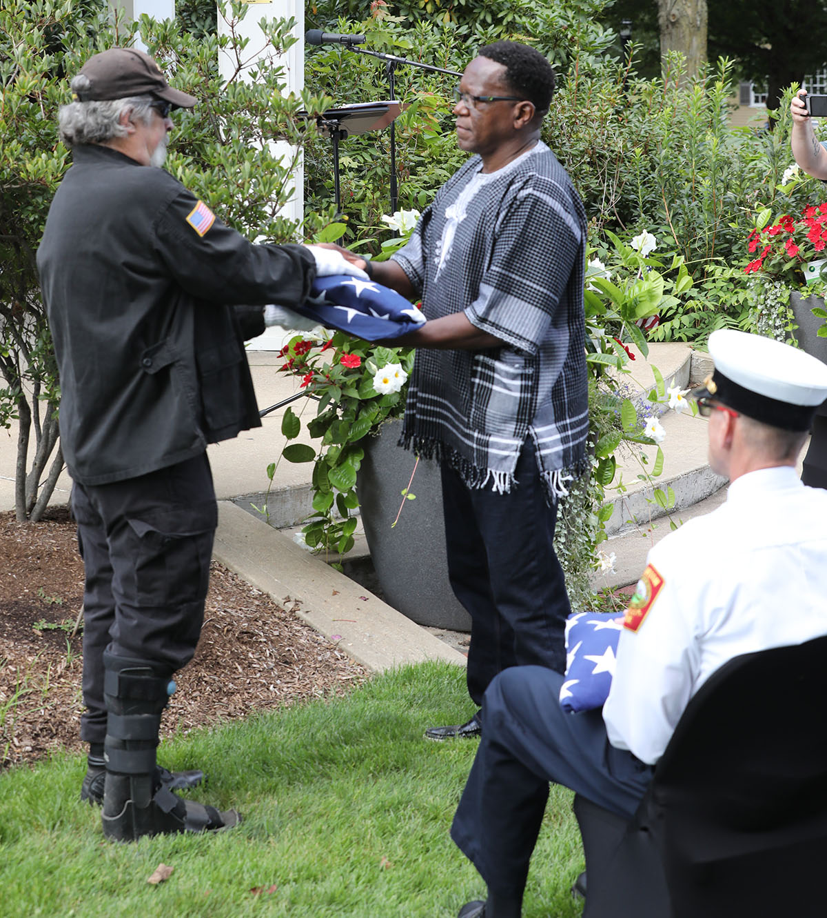- Town Manager Norman Khumalo receives an American flag from a member of Old Guard New England. PHOTO/JOHN CARDILLO