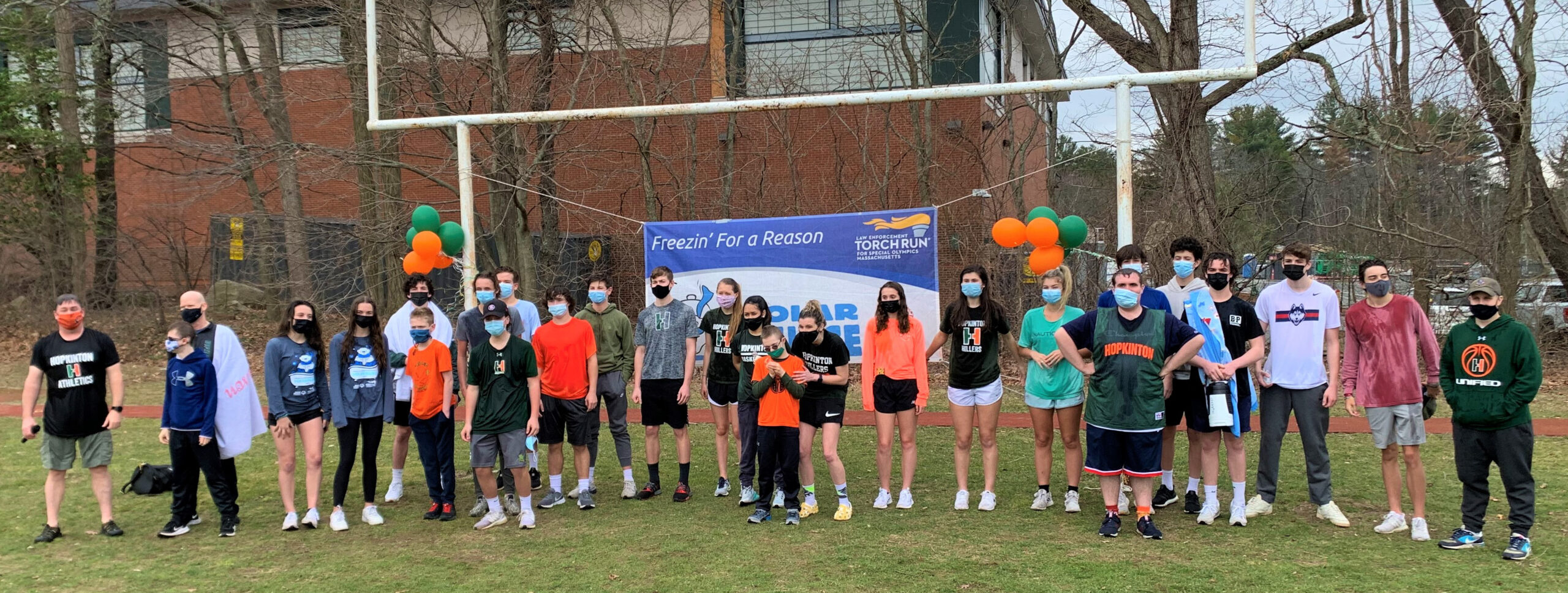 - Participants pose in front of the Polar Plunge banner outside Hopkinton High School.