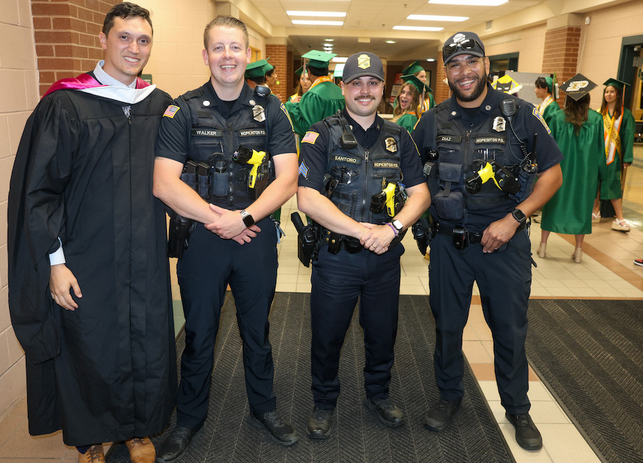 HHS athletic director Ricky Andrade stands with Hopkinton Police Officer Nick Walker, Sgt. Matthew Santoro and School Resource Officer Augusto Diaz. PHOTO/JOHN CARDILLO