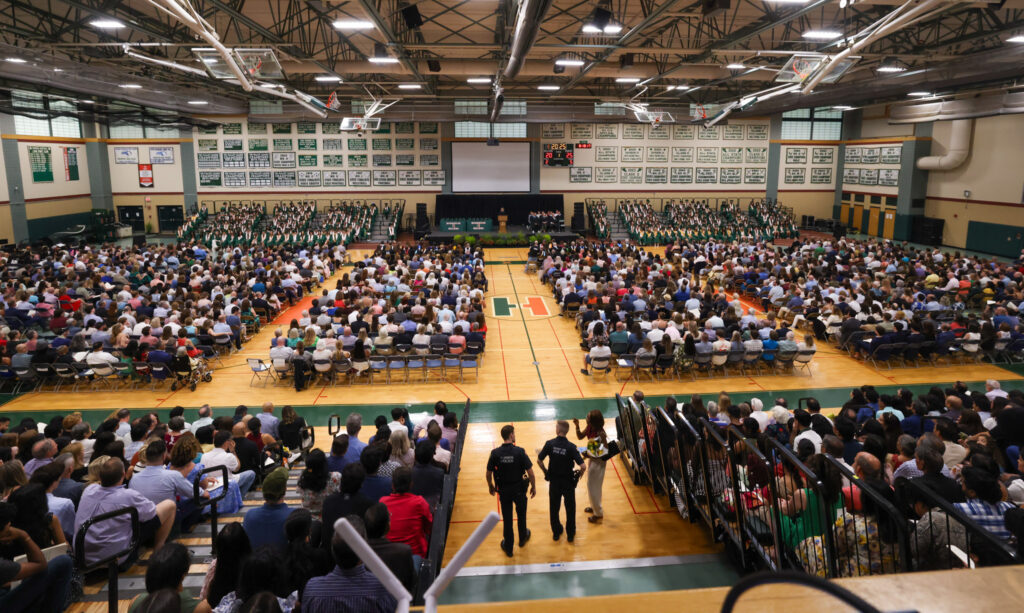 The athletic center is filled after the ceremony was moved inside due to wet weather. PHOTO/JOHN CARDILLO