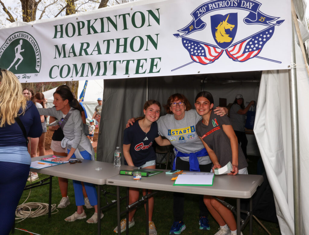 Volunteers at the Hopkinton Marathon Committee booth pose for a photo. PHOTO/JOHN CARDILLO