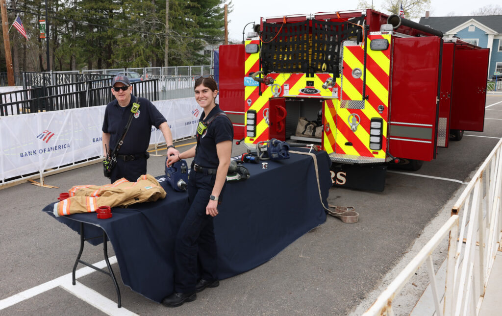 Hopkinton firefighters stand by a display of firefighting equipment. PHOTO/JOHN CARDILLO