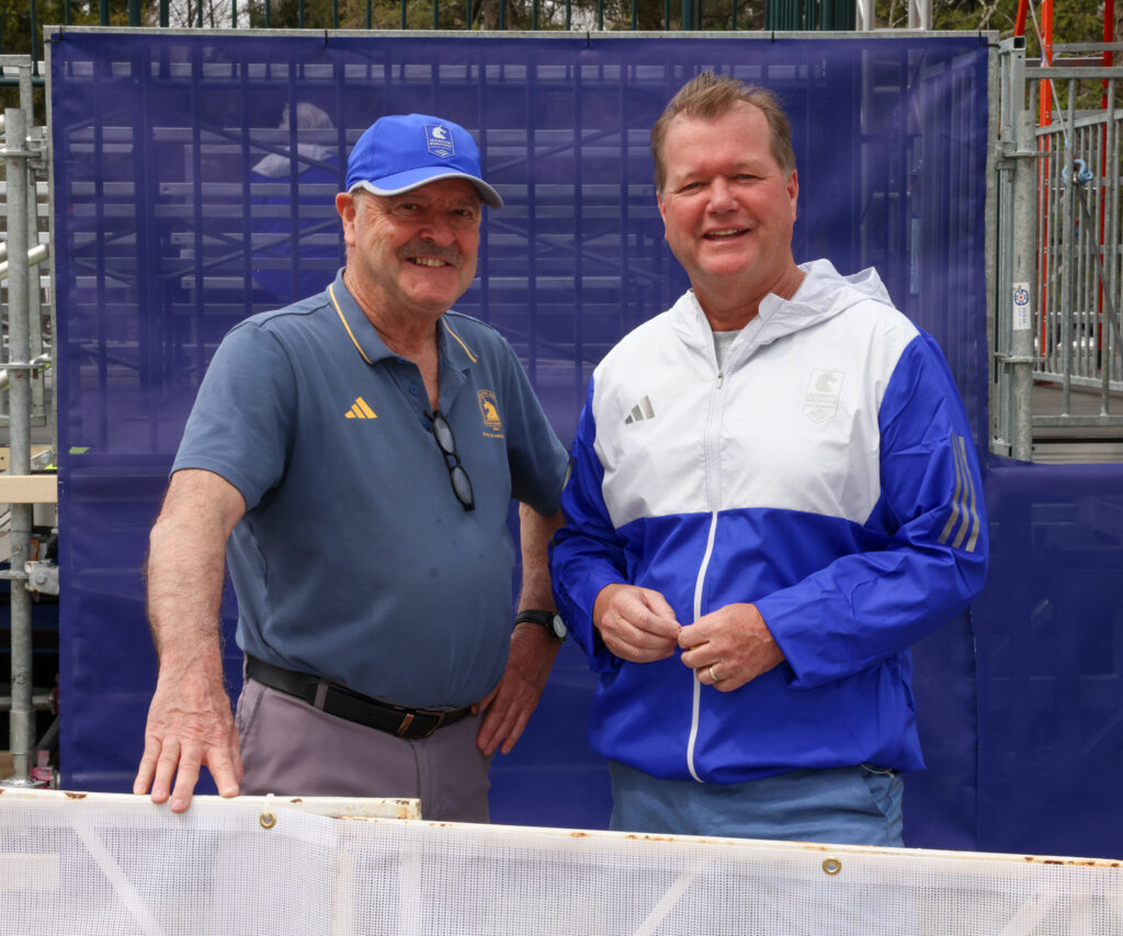 Select Board chair Brian Herr (right) hangs out with race announcer Jack LeDuc. PHOTO/JOHN CARDILLO