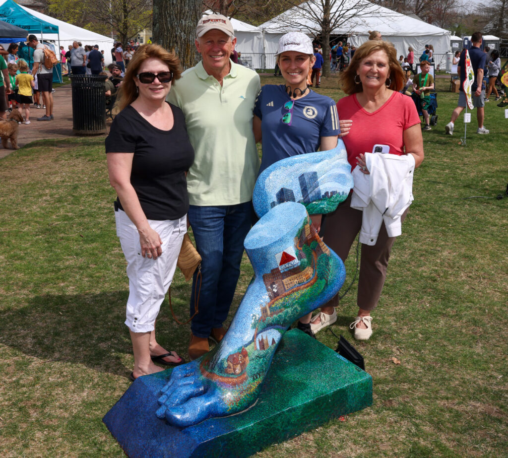Standing with a winged foot statue on the Town Common are (from left) Joan Hayes, Gil Campos, Krisanne Campos Connell and Karen Campos. PHOTO/JOHN CARDILLO