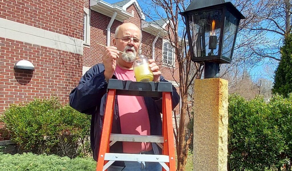 In a contributed photo from earlier last week, Len Holden, a member of the 26.2 Foundation board, performs maintenance on the Marathon eternal flame in front the Police Station. As part of the yearly maintenance, the gas was turned off so the lantern could cool, a year’s worth of soot was cleaned from the glass, and the flame — which originally came from Marathon, Greece — was relit.