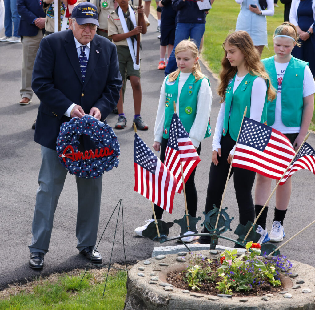 Girl Scouts join Hopkinton veteran Bill Hamilton to place a wreath. PHOTO/JOHN CARDILLO