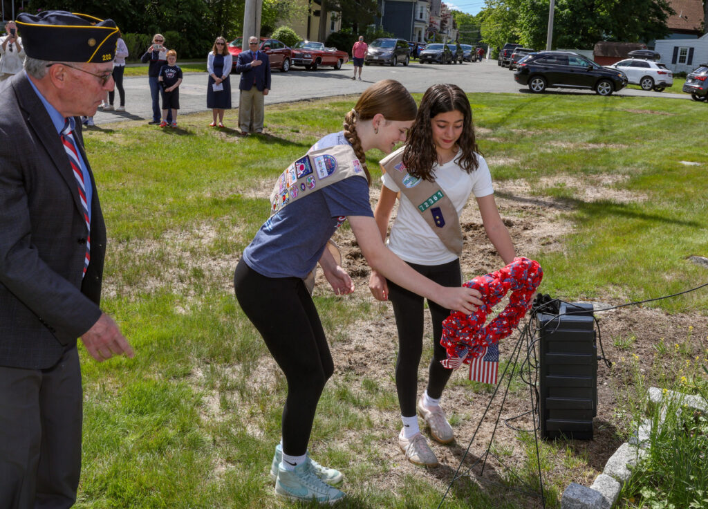Girl Scouts place a wreath at a memorial on Mayhew Street. PHOTO/JOHN CARDILLO