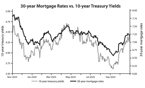 The inflation rate is closer to the Federal Reserve’s target of 2%, sitting at 2.7% as of December 2024; a significant decline from 9.1% in June 2022. The Fed cut its rates for the first time in four years on Sept. 19, 2024, from 5.5% to 4.5% on Dec 18, 2024, and signals two rate cuts in 2025. So why are mortgage interest rates still high? Thirty-year mortgage interest rates tend to trend 2%-3% higher than the 10-year treasury yield over the last five years. Many of the same investors compete for both treasury bonds and mortgages, but mortgages are higher due to their increased risk. Further, Jess Schulman, president of Bluebird Lending, indicates investors in capital markets buying mortgages need to be incentivized to purchase bonds. If 10-year treasury yields go up, so do mortgage rates, and vise versa. Unemployment, inflation and other economic factors also come into play.