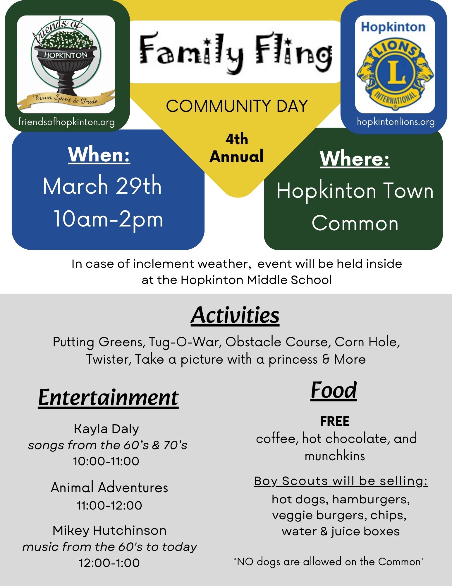 The Friends of Hopkinton and the Hopkinton Lions present the annual Family Fling, a community day at the Town Common, on Saturday, March 29, from 10 a.m.-2 p.m. Activities will include musical entertainment, Animal Adventures, putting greens, tug of war, obstacle...